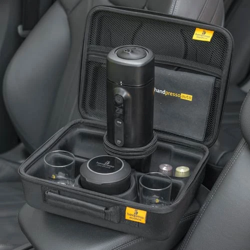 Simply connect the Handpresso espresso machine to the cigarette lighter in your car, add water and a Nespresso compatible coffee capsule. In about 2.5 minutes, your espresso will be ready, tracked by a digital tracking/monitoring screen.