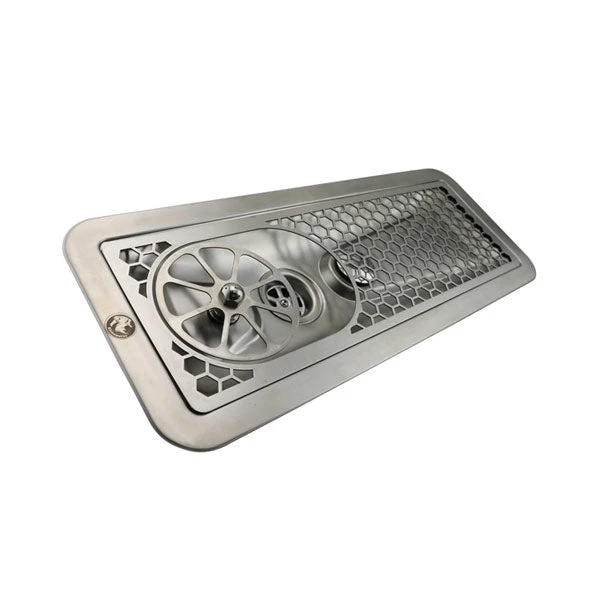 The RHPR600-H includes a standard Rhino 600mm Rinser as well as the new hexagonal grate design. This new grate allows for better drainage and less surface area, minimising liquid build-up on the grate.